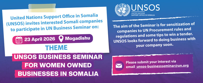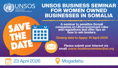 Mogadishu - The United Nations Support Office in Somalia (UNSOS) invites interested Women-Owned Businesses in Somalia to participate in the UN Business Seminar on 23 April 2026 in Mogadishu.