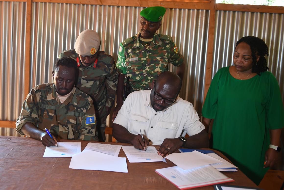 The Somali National Army (SNA) Commander for Bio Cadale FOB, Capt. Ahmed Ali Takow, signed the handover documents to signify the transfer of security responsibilities which was witnessed by a representative of ATMIS Force Headquarters, Lt. Col. Edouard Nzohabonayo and, the UNSOS Chief of Transition Planning Cell, Patrick Duah, and the Deputy Chief of the Operations Department for the SNA, Maj. Muhudin Ahmed.