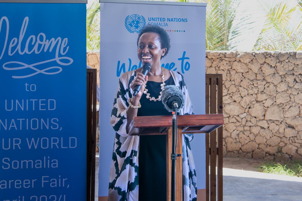 Dr Aisa Kirabo Kacyira, Head of United Nations Support Office in Somalia (UNSOS), addressed the students highlighting the fairs significance in capacity-building and opening doors to UN careers.