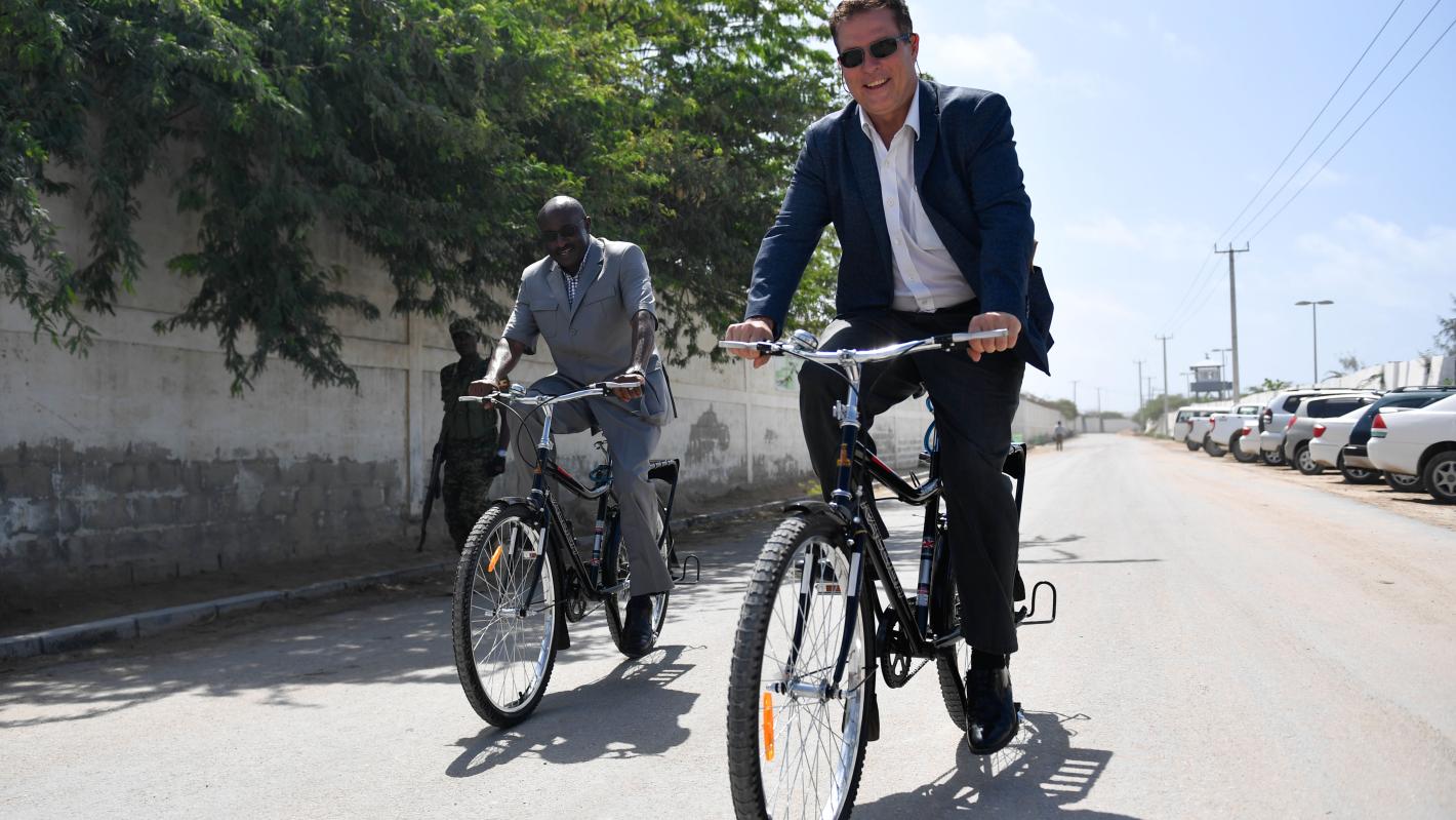 Simon Mulongo (left), the Deputy Special Representative of the Chairperson of the African Union Commission (DSRCC) for Somalia, receives a bicycle from Richard Oyoo, the United Nations Support Office in Somalia (UNSOS) Environment Affairs Officer, at the UN/AMISOM base camp in Mogadishu on 11 June 2019. AMISOM, UN and non-UN personnel participated in various activities to mark the World Environment Day, celebrated every year on 5th June. UN Photo / Ilyas Ahmed