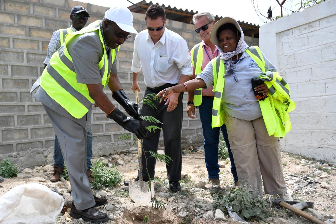 Simon Mulongo, the Deputy Special Representative of the Chairperson of the African Union Commission (DSRCC) for Somalia (in white cap), Clark Toes, the UNSOS Chief of Service Delivery (in white shirt) and UN contractors plant a seedling along a road in the UN/AMISOM base camp in Mogadishu, Somalia, on 11 June 2019. This was part of activities to mark the World Environment Day, celebrated every year on 5th June. UN Photo / Ilyas Ahmed